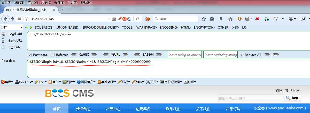 这里并没有对用户信息做检查,只是单纯的判断了是否存在login_in admin这两个session标识位和是否超时而已,构造payload: