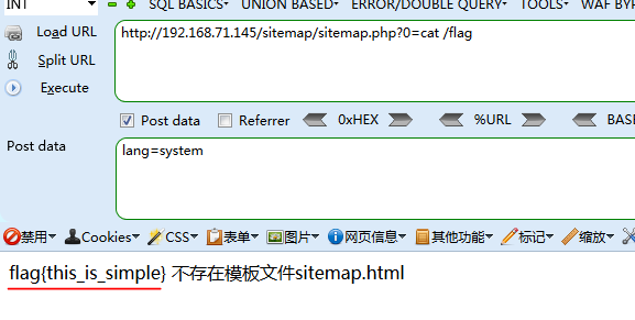 看到$_POST‘lang’;很明显,这是一个木马,但是比常见的一句话木马稍微复杂一点,需要构造参数lang和0: