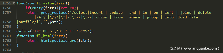 在fun.php的971行可以看到SQL语句对user参数进行了拼接,猜测fl_value()和fl_html()是对user进行过滤,跟进分别看下: