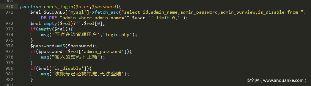 在42和43行发现对user和password进过fl_value()和fl_html()处理,然后送入check_login(),跟进check_login()看下: