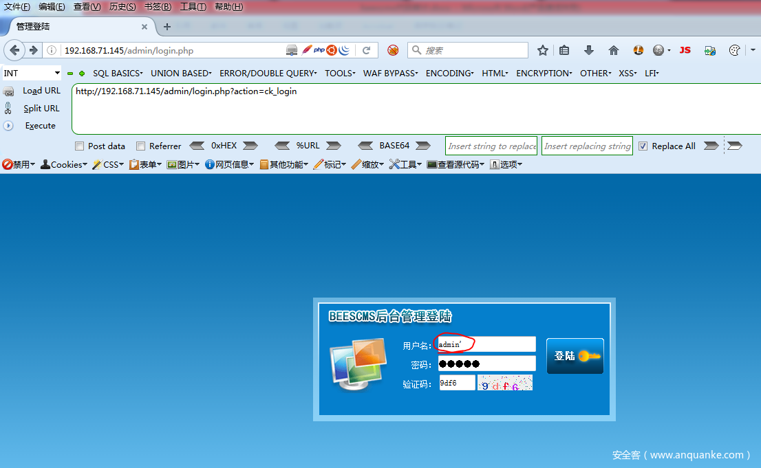 在后台登陆用户名处加个’测试一下SQL注入: