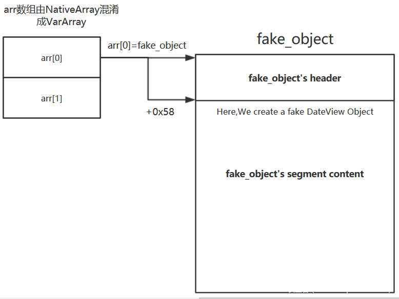 在原漏洞中发生类型混淆,使得原来NativeFloatArray类型的arr变为VarArray类型,并且arr[0]的内容由原本的浮点数变成指向fake_object数组的指针。