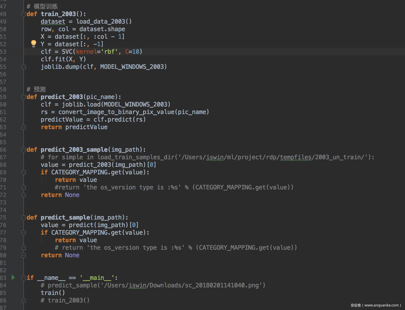 处理完之后其实对于2003来说就是个二分类问题,即是不是2003版本,对于2003以上版本就是个多分类问题,这里主要是区分图片里面的关键元素,一般在实际处理的时候可以不用考虑图片的颜色,即将图片二值化,然后根据图片的Length*Width来作为特征向量的维度,用0和1表示黑白两种颜色,这样就可以将图片转换为可以用于计算的数学上的值,当然如果你直接用ocr去识别图片中的文字,当然也是可以的,不过效率和效果很一般,为了提高效率和识别效果我们采用Scikit-learn中的SVM算法来进行有监督的学习,这样在工程化的时候也比较好嵌入到我们已有的项目中。