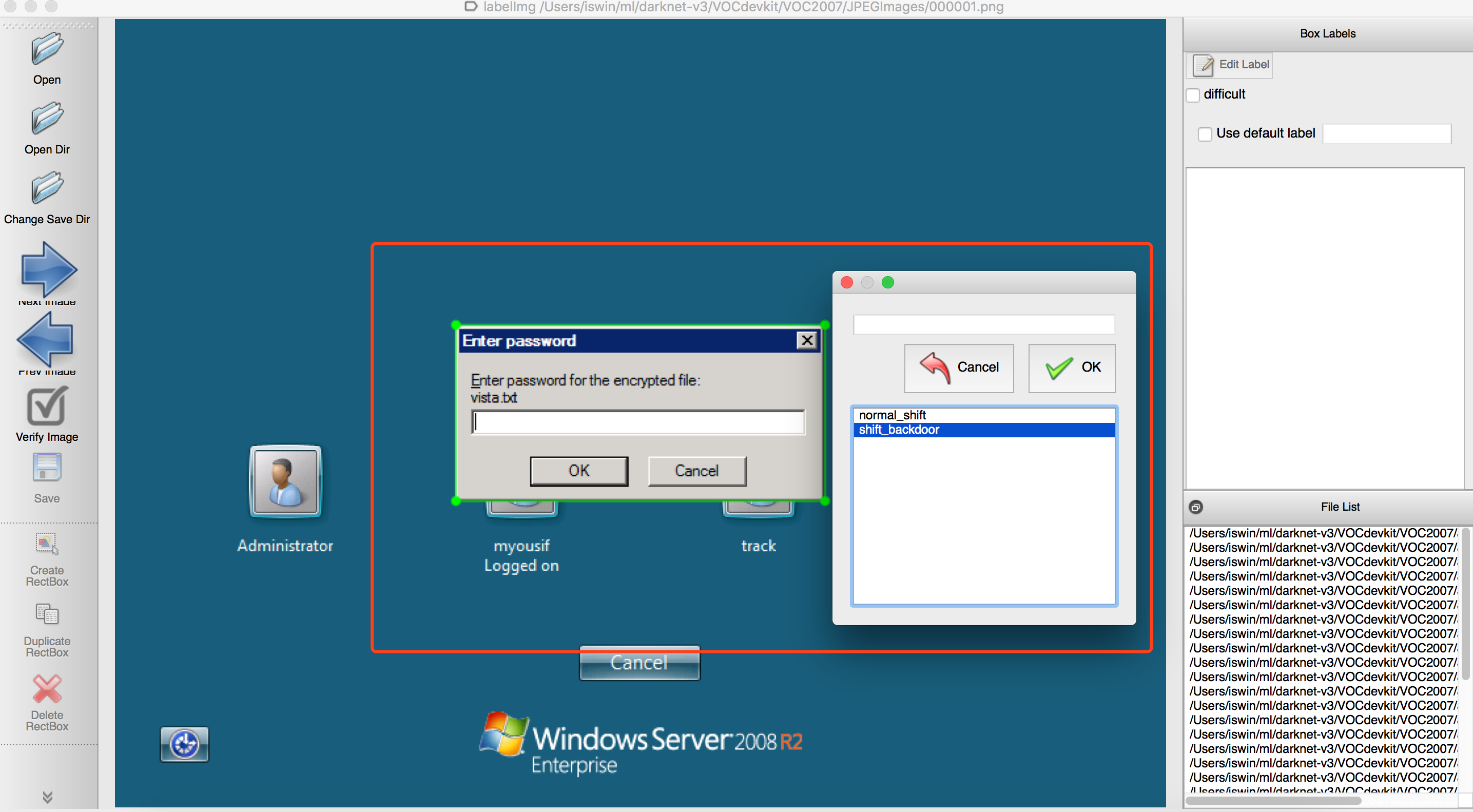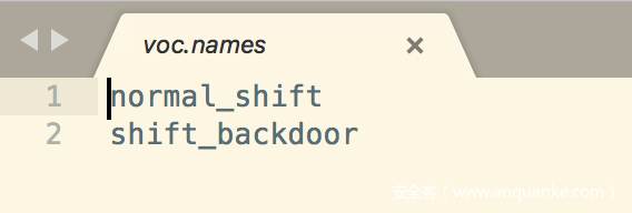 图片标记使用https://github.com/tzutalin/labelImg ,然后对每张图片进行标记,我们目前只有两个分类:normal_shift、shift_backdoor,例如
