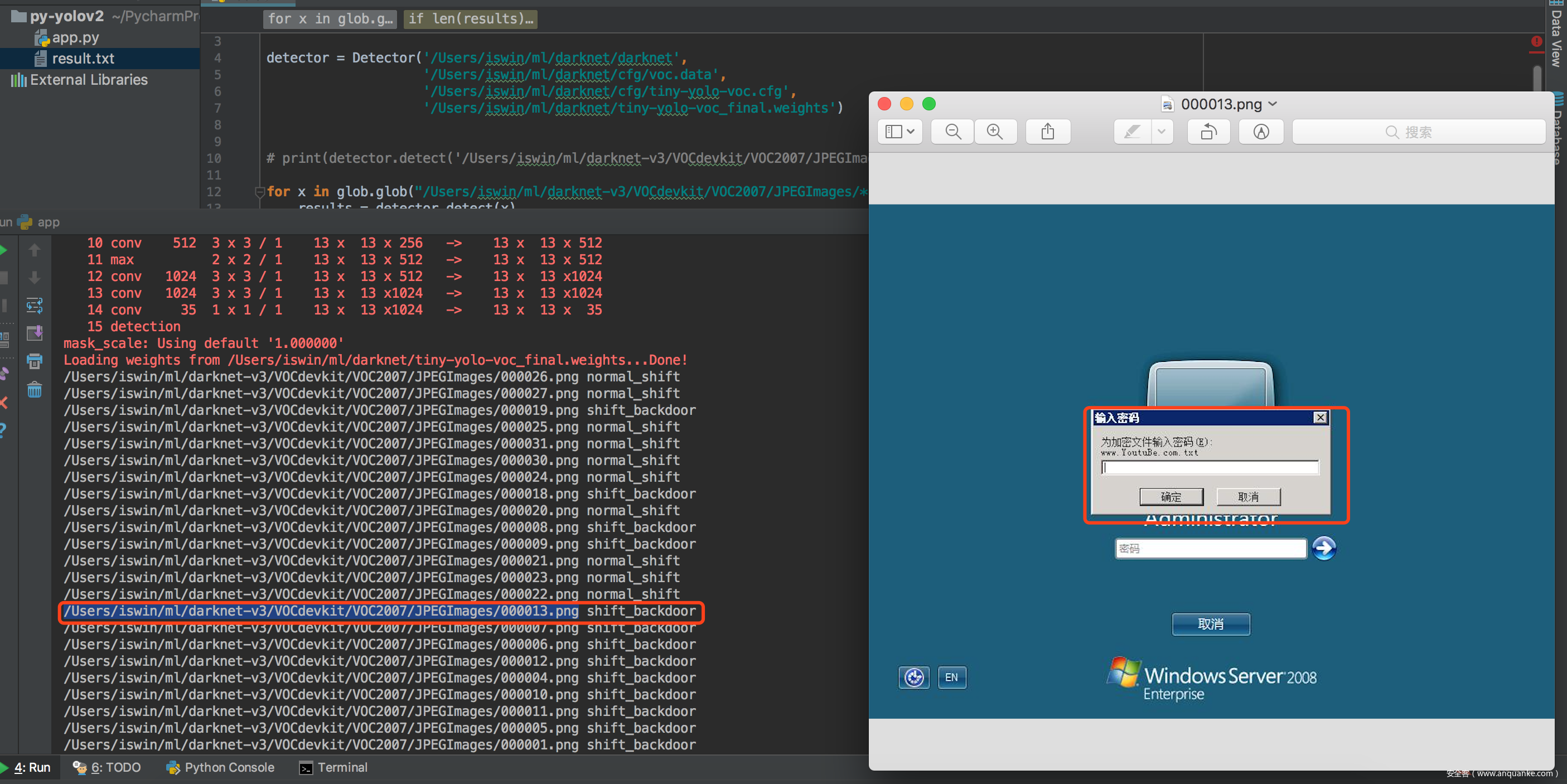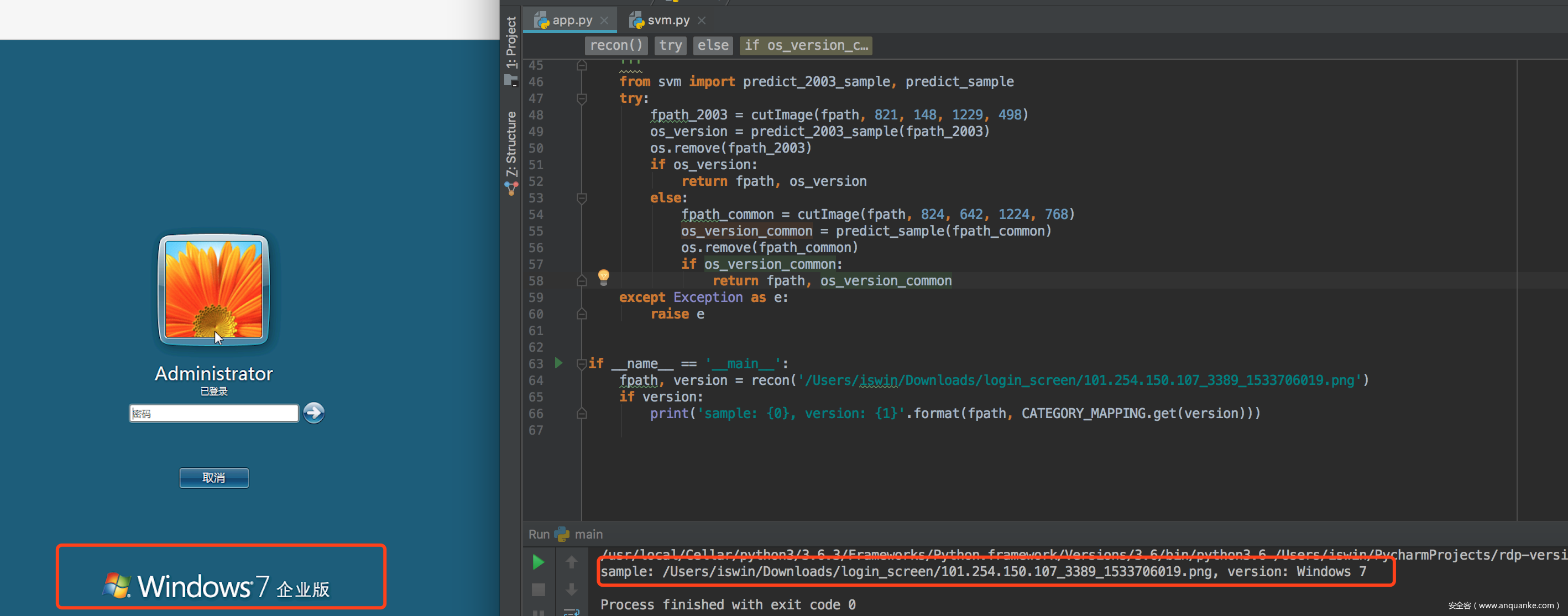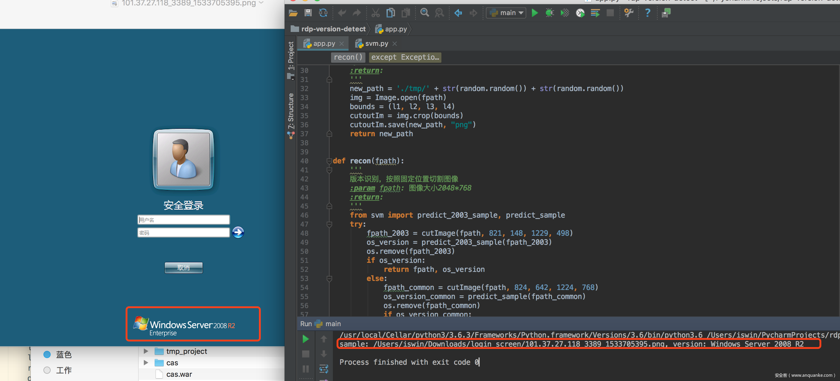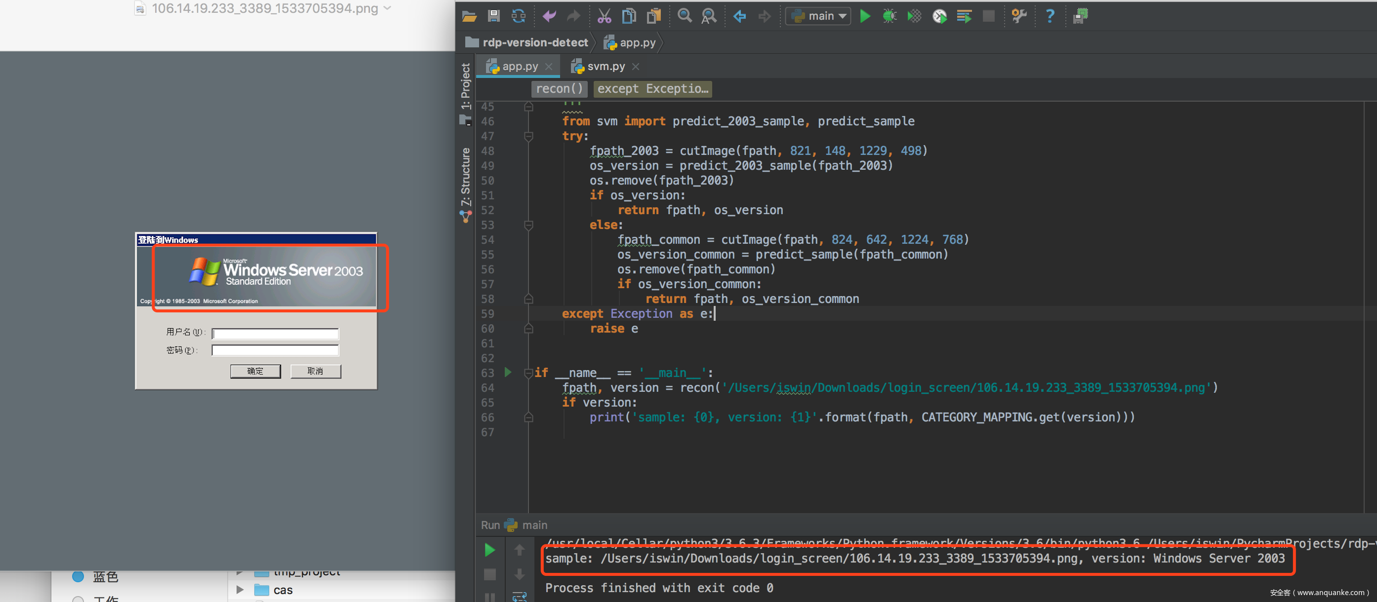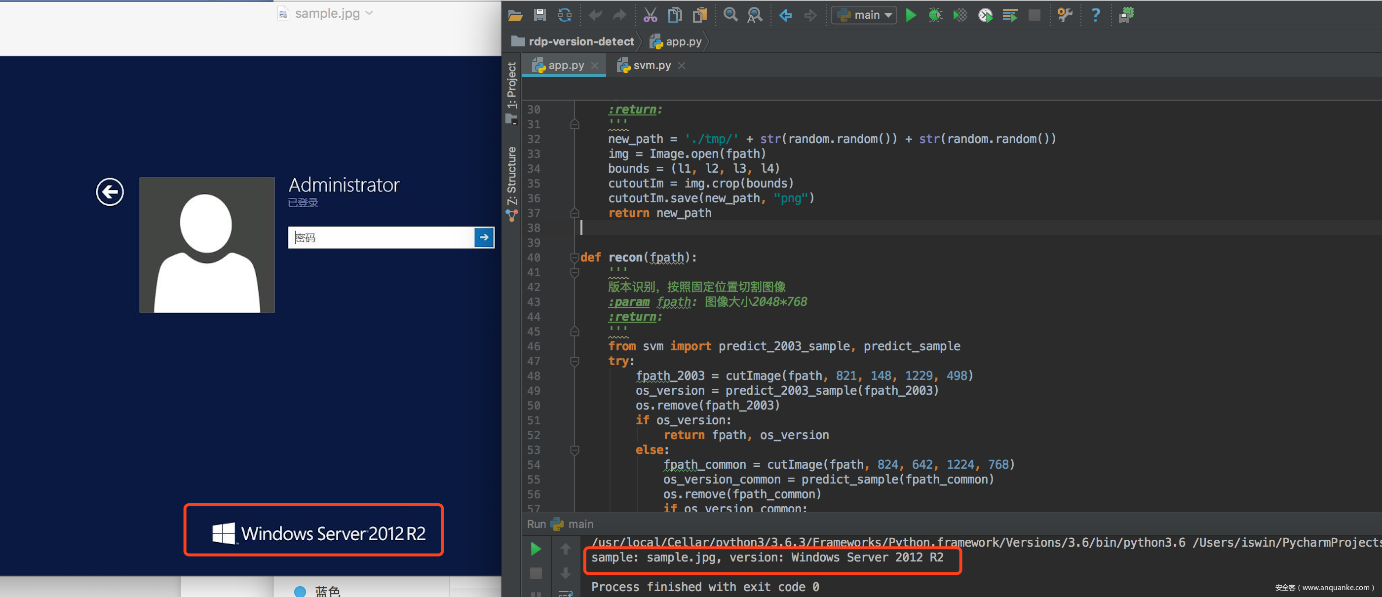 所以我们的整体解决方案就是使用rdpy来实现截图逻辑,版本识别使用机器学习技术,用原始图片样本固定位置截图进行训练,RDP后门检测则基于版本识别的结果(不同版本服务器shift后门弹框位置不一样)训练样本进行识别,关键信息提取直接用原始图片进行关键位置的文字识别即可。