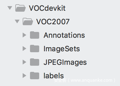 YOLO的使用大家可以参考作者的博客https://pjreddie.com/darknet/ ,这里有相关的原理Paper,当然还有一些训练好的模型可以直接用,安装过程就不详细解释了,包括GPU环境的编译,作者博客上都有详细的说明,YOLO是一个目标检测框架,作者提供了两种类型(PASCAL VOC、COCO)的数据集来进行模型的训练,我们可以根据这两种类型来定制自己的数据集来训练自己的模型,本文采用PASCAL VOC2007类型来指定自己的数据集,PASCAL VOC2007数据集的目录结构如下: