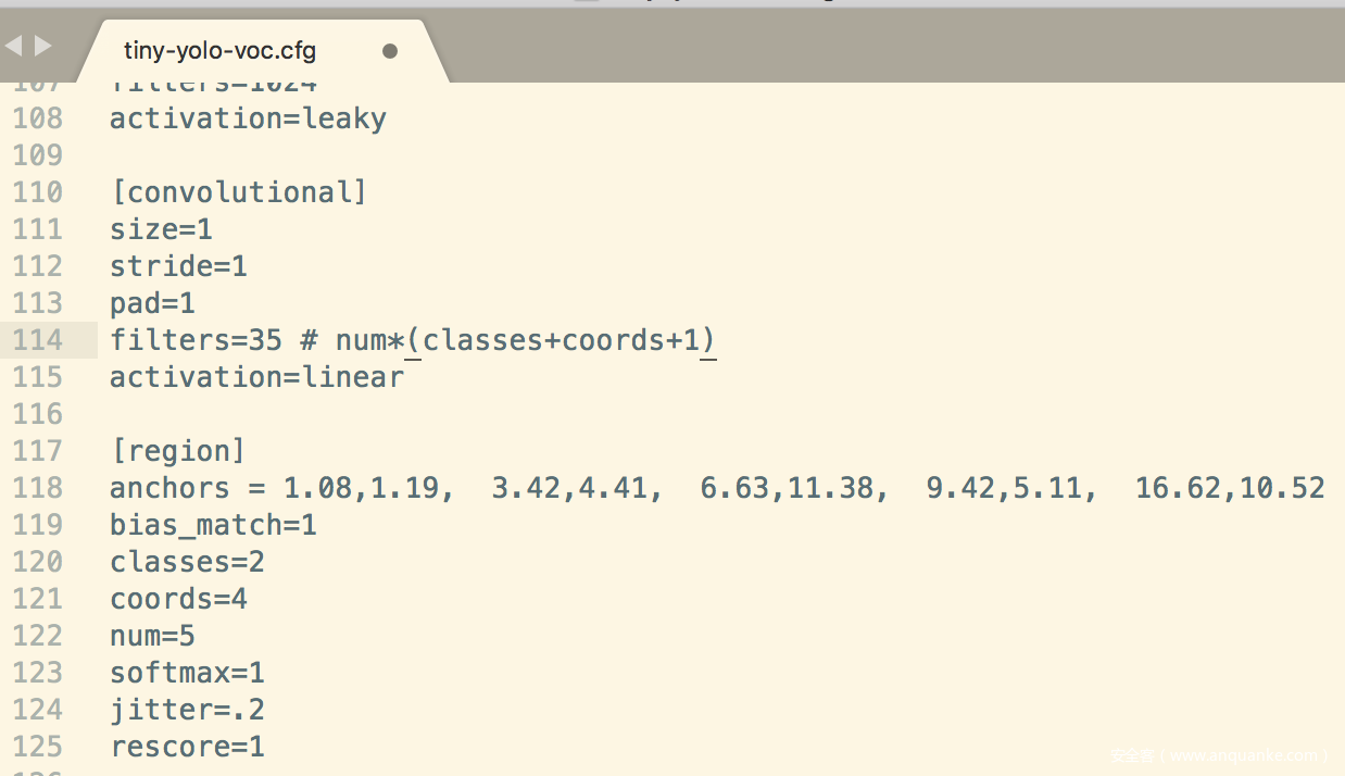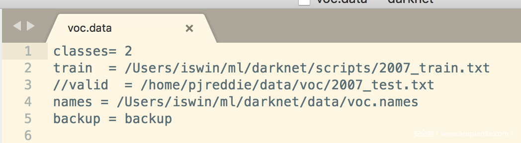 修改YOLO的训练的参数,这里主要涉及YOLO的三个文件cfg/voc.data、cfg/tiny-yolo-voc.cfg、data/voc.names,具体的参数信息大家可以根据自己的类别来设置,这里以两个类别为例子。