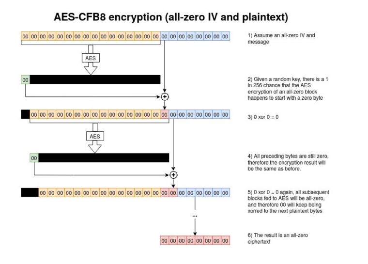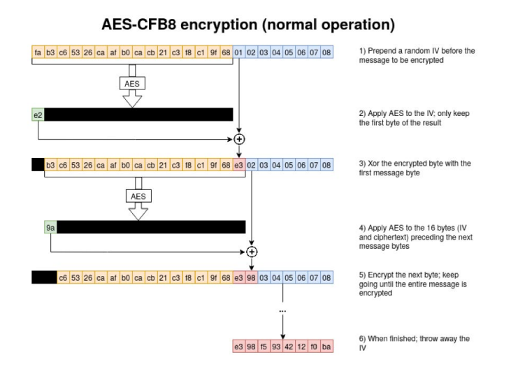 图1-1中攻击者可控的因素有client challenge,攻击者将它设置为全0,server challenge在每一轮认证过程中都会变化,secret对应于用户密码的hash,Encrypt的过程采用的是AES-CFB8,其运算过程如下: