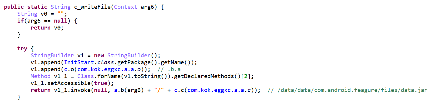 完成下载每个有效负载后,WAPDropper会将下载的DEX文件解密为.jar文件,并将其本地存储在受感染的设备上。