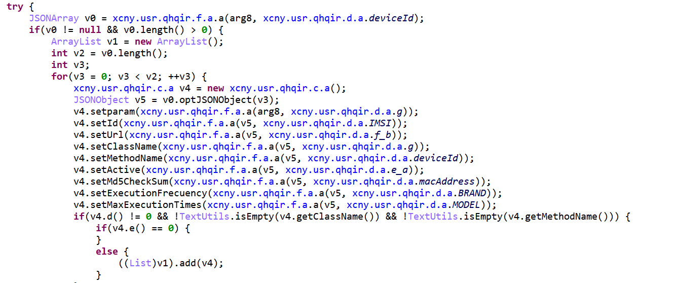 WAPDropper加载解密的.jar文件,并立即将其从设备中删除,以避免留下痕迹。每个有效负载都具有在JSON配置中配置的执行频率。WAPDropper会针对每个不同的有效负载监视此频率。