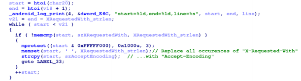 “X-Requested-With”是一个HTTP标头,用于验证CSRF(跨站请求伪造),即是一种挟制用户在当前已登录的Web应用程序上执行非本意的操作的攻击方法。WAPDropper将所有出现的“X-Requested-With”字符串替换为“Accept-Encoding”字符串,这导致禁用对CSRF攻击的防护。