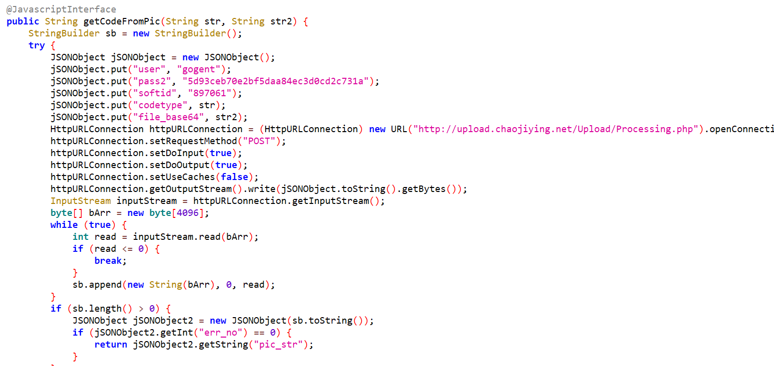WAPDropper选择下载图片并将其发送到服务器,或者解析图片的DOM树,提取图片,使用Base64对其进行编码,然后将其发送至服务器:https://upload.cha***ing.net/Upload/Processing.php。该服务器是由国内某公司提供的基于ML的图像验证代码识别和图像分类服务。当恶意软件将验证码图像提交给服务时,平台会在图片中返回识别结果的坐标位置,然后解析坐标模拟登陆。