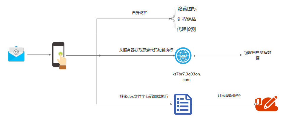 恒安嘉新App全景态势与情报溯源挖掘平台监测到一款名为“Email”,仿冒邮件标识的安装图标,安全研究人员发现该应用具有WAPDropper特征,在用户设备感染该恶意软件后,会执行隐藏图标,延迟执行,进程永久运行,强加密混淆,环境检测等一系列自身防护操作,一旦进入受害设备,便会连接C2服务器获取恶意代码并加载执行,然后利用反射调用机制执行高级服务订阅模块,打开一个小的Web视图,加载执行恶意JS代码,并使用第三方提供的图像验证代码识别绕过验证步骤,最终实现为用户订阅高级服务的目的,执行流程原理如图1所示,执行过程中,该恶意程序会删除所有HTTP请求中的“ X-Requested-With”标识,禁用对CSRF(跨站请求伪造)攻击的防护。