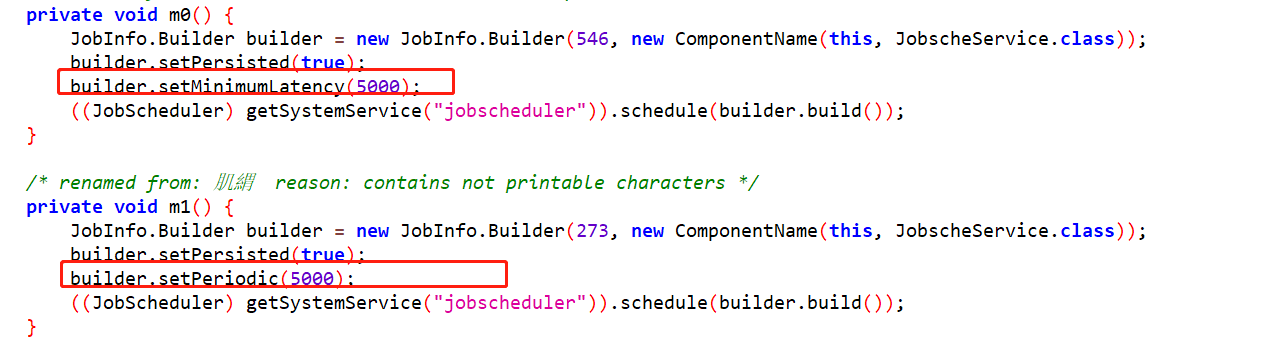 (1)由于JobService的任务是由系统来维护的,通过设置每隔5000毫秒、最小延迟5000毫秒执行一次任务,能避免系统杀死后台进程,以达到进程保活的目的。