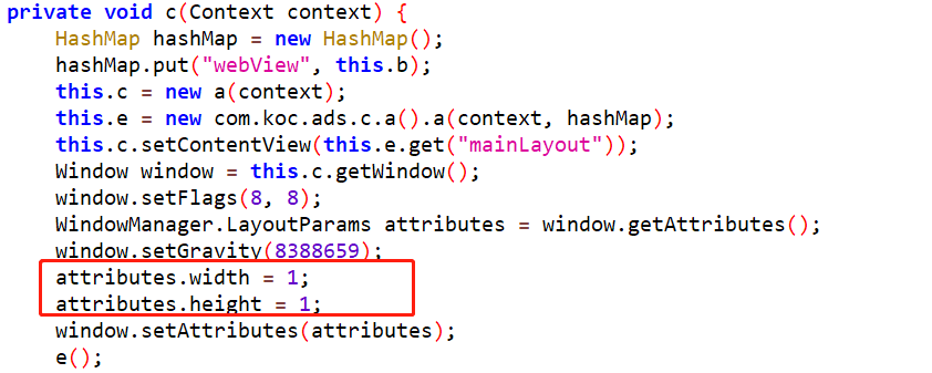 收到广告报价后,该恶意软件会构建一个1×1像素的对话框,该对话框几乎看不见,但实际上包含一个很小的Web视图: