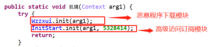 恶意软件在执行完以上操作后便通过调用初始化函数执行恶意程序下载模块和高级服务订阅模块: