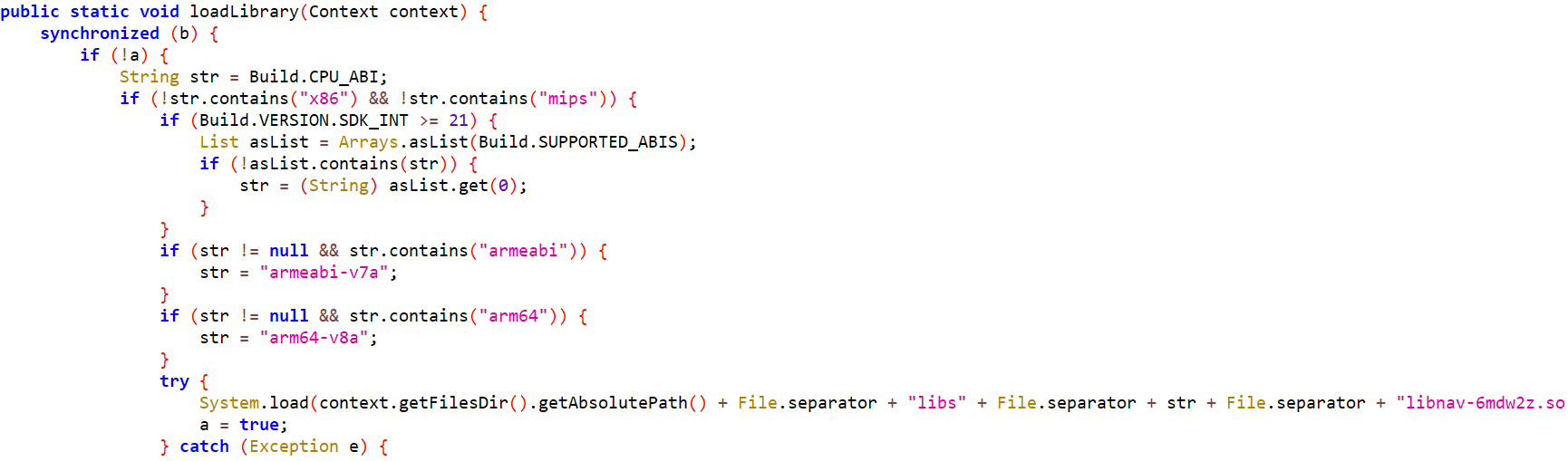 高级访问订阅模块首先会解密存储在其代码中的文件字节码,并通过一系列反射调用将其写入名为“data.jar”、“libnav-6mdw2z.so”的本地文件中。