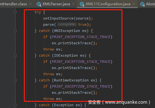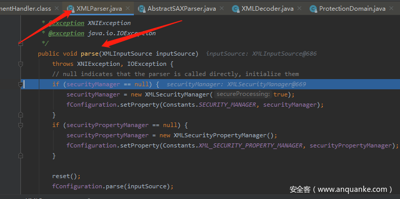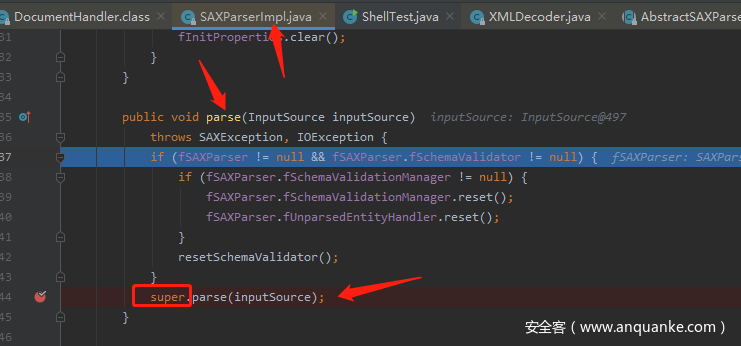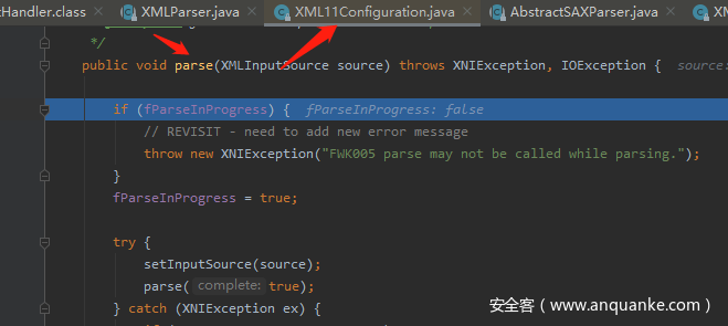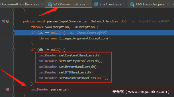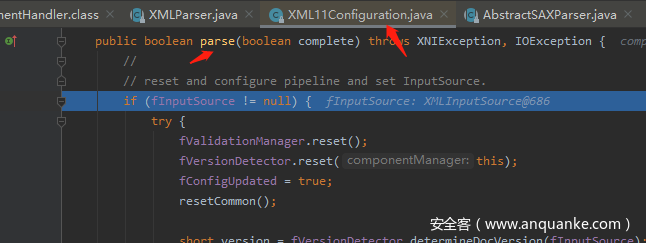 SAXParserImpl中有一些配置,其中的xmlReader是前面已经设置过了,是接口对象new的实现类,我们看的是实现类,这里有idea可以自动进行跳入对应的实现类的方法。