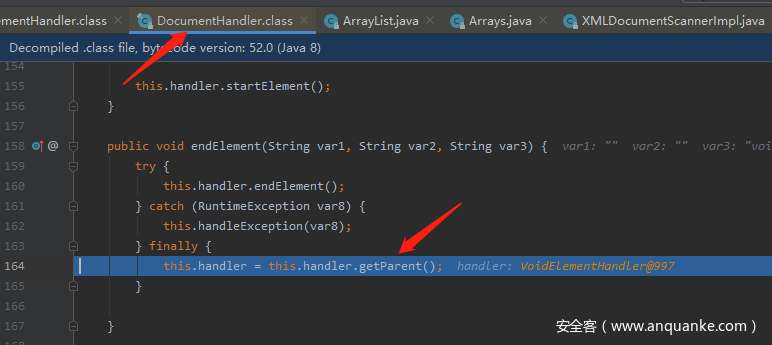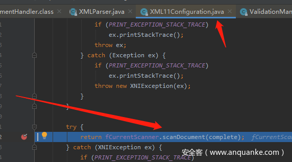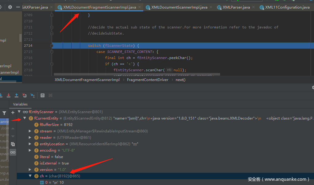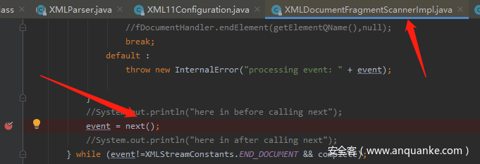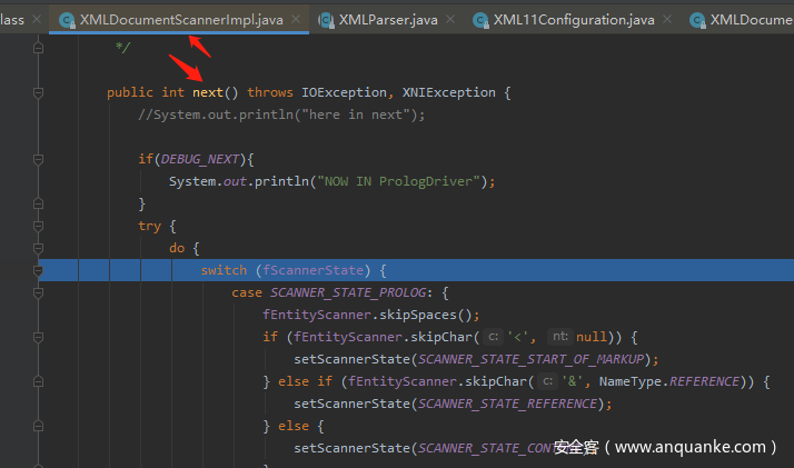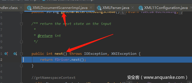 进入XMLDocumentFragmentScannerImpl后,会看到有方法中进行了do{}while{}方法,其中的next方法是重点。