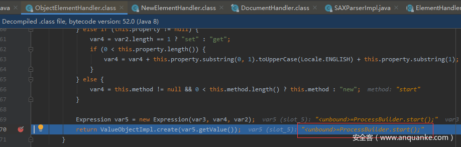 ProcessBuilder这个类在xml文件中有申明,然后到了invoke,成功执行命令。