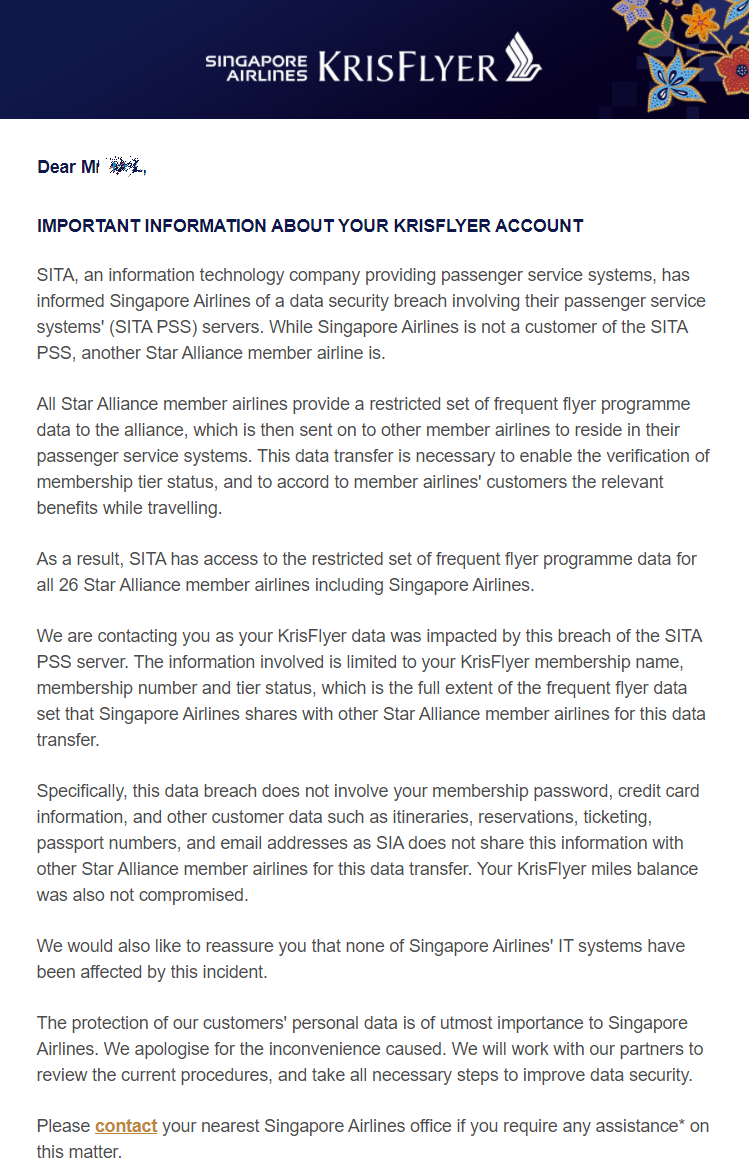 公布信息显示,SITA因黑客攻击造成的数据泄露事件,具体泄露信息涉及服务卡号、状态级别,个别情况下还可能包括乘客姓名等,而密码、电子邮件等敏感信息暂不受影响。目前,受波及航空公司已陆续向受影响顾客发布告知邮件。