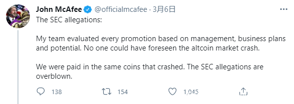 3月6日,迈克菲通过Twitter回应了检方指控,称其此前对于加密货币的销售与潜力评估,都是按照市场运转的正常操作,没有人能预料到市场崩盘,检方的指控夸大其实了。