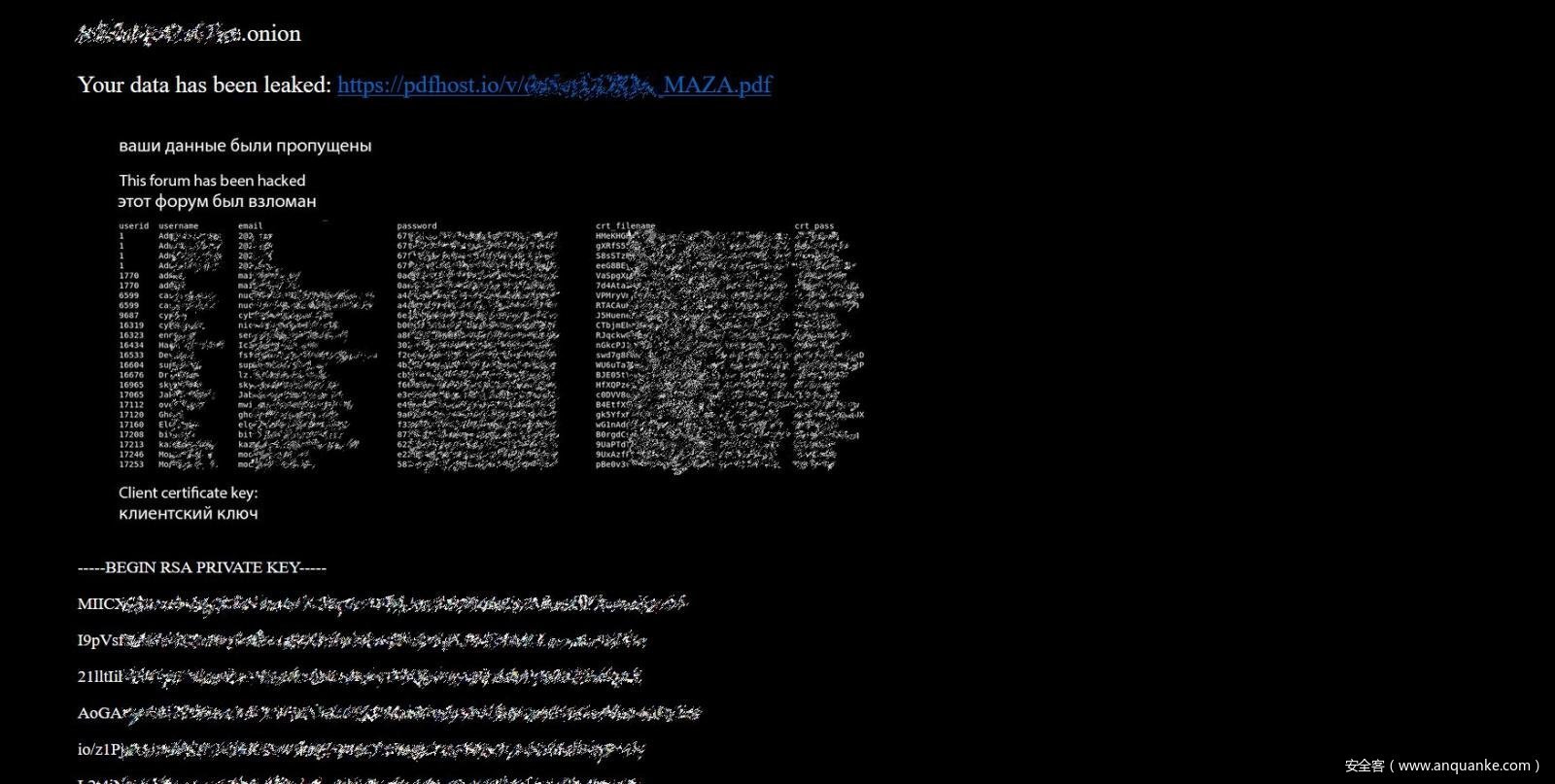 近日,俄语系网络犯罪论坛Maza遭遇不明攻击,导致2000+注册用户信息泄露。