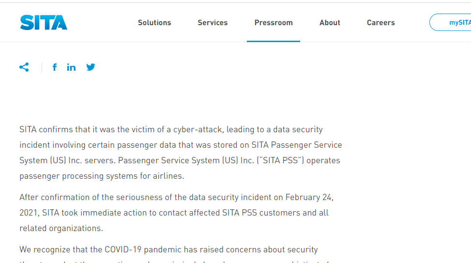 近日,全球最大航空业IT服务提供商SITA遭黑客攻击,所导致的数据泄露波及全球十余家航空公司,初步估算受影响旅客总数将超210万。SITA发表声明称,安全事件由黑客攻击引起,涉及存储在SITA旅客服务系统(Passenger Service System)服务器上的多家航司乘客数据。