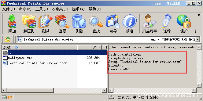 病毒附件Technical Points for review.exe是使用WinRAR生成的自解压程序,该自解压程序的运行逻辑为:在C:\intel\logs目录下释放mobisynce.exe及一个与样本相同名称的正常Office Word文档,然后执行EXE病毒文件同时打开Office Word文档以迷惑受攻击者: