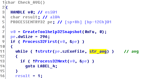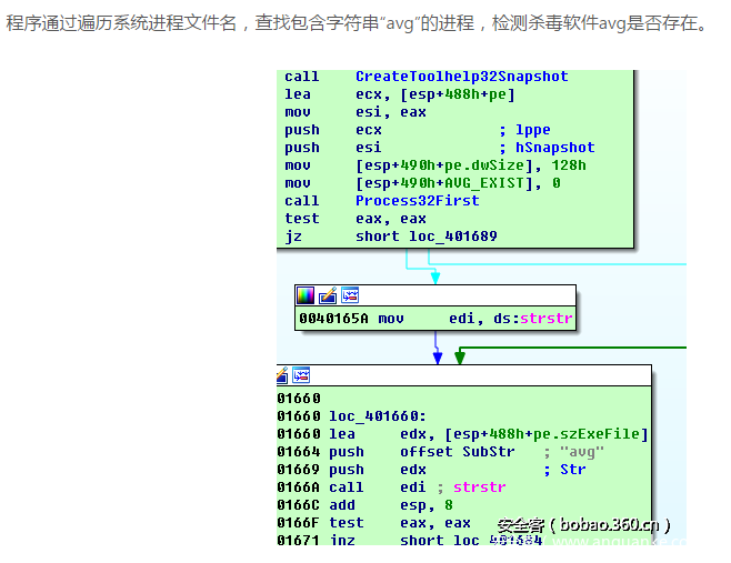 紧接着查找当前进程列表名中是否有包含”avg”字符串的进程来判断是否存在avg相关的杀毒软件: