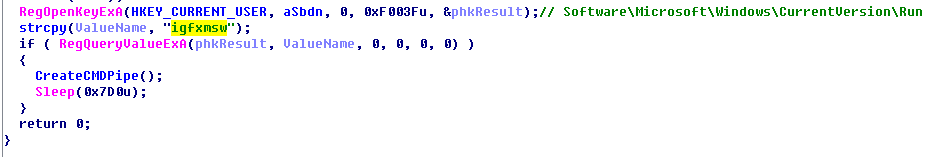 如果不存在与avg相关的杀软进程,则创建新线程,并在该线程中判断是否存在注册表启动项“HKCU\Software\Microsoft\Windows\CurrentVersion\Run\igfxmsw”,以此避免重复执行后续的后门功能,如果不存在该注册表项,则创建后门进程并通过管道的方式接收执行后续的攻击者指令: