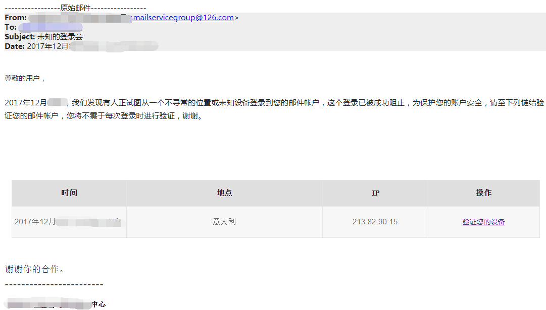 上个月某一天,某敏感工业企业邮箱用户收到一份发自mailservicegroup[@]126.com的钓鱼邮件,钓鱼邮件仿冒企业的信息技术中心通知目标用户,声称其邮件账户登录异常,并提示通过“安全链接”验证邮件账户: