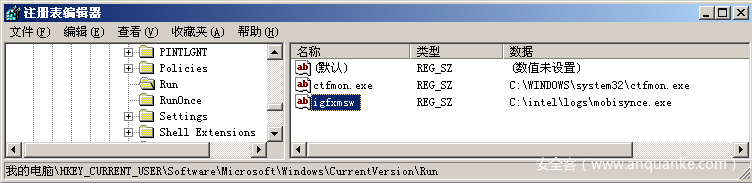 创建注册表启动项“HKCU\Software\Microsoft\Windows\CurrentVersion\Run\igfxmsw”,并设置mobisynce.exe为自启动: