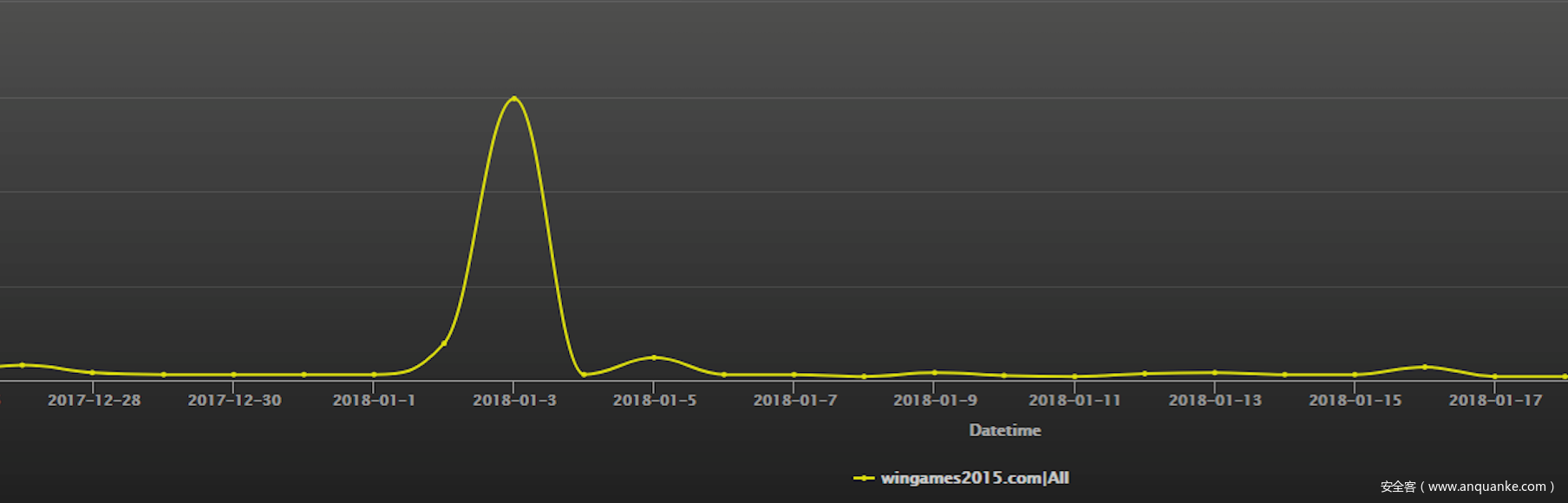 根据360网络研究院的大网数据,对于wingames2015.com C&C域名访问在2018年1月3日达到过一个高峰,暗示在这个时间点攻击者曾经发动过一大波攻击:
