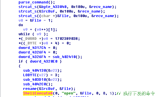 最后,mobisynce.exe会循环监听执行后门命令,具体逻辑为当C&C服务器向木马发送含有”Yes file”字符串的指令时,木马会在指令中提取”[”与”]”中间的命令,并通过ShellExcuteA函数执行该命令: