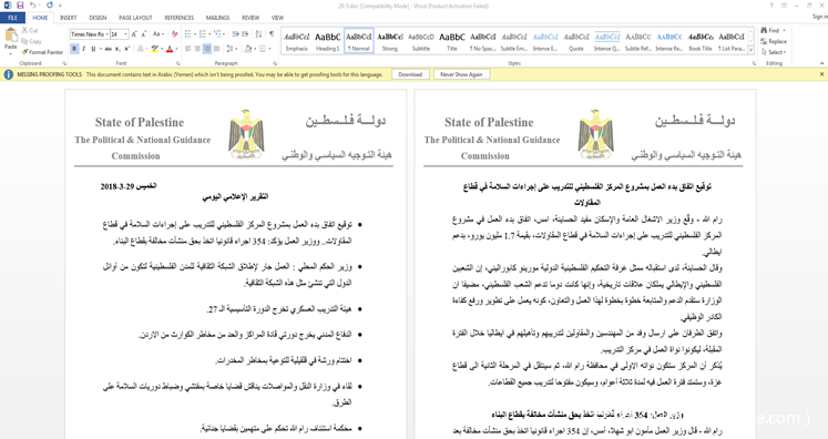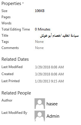 尽管存档文件是在4月中旬被发现的,但Word文档显示它的最后一次编辑时间是在2018年3月29日。这个日期在文档正文中也被提及,并作为标题“29-3.doc”。 该文档中的元数据显示,它也被命名为“سيادةالعقيع/دصامأبوعوكل”,这恰好是指导委员会办公室的首席执行官的名字: