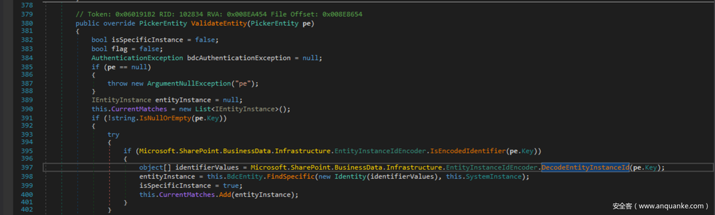 首先看到的一个调用 XmlSerializer(Type) 的地方是 Microsoft.SharePoint.dll 中的Microsoft.SharePoint.BusinessData.Infrastructure.EntityInstanceIdEncoder.DecodeEntityInstanceId(string)。相同的类型也同样出现在 Microsoft.SharePoint.Portal.dll 的Microsoft.Office.Server.ApplicationRegistry.Infrastructure中。下面,我先先看看 Microsoft.SharePoint.dll 中的代码。