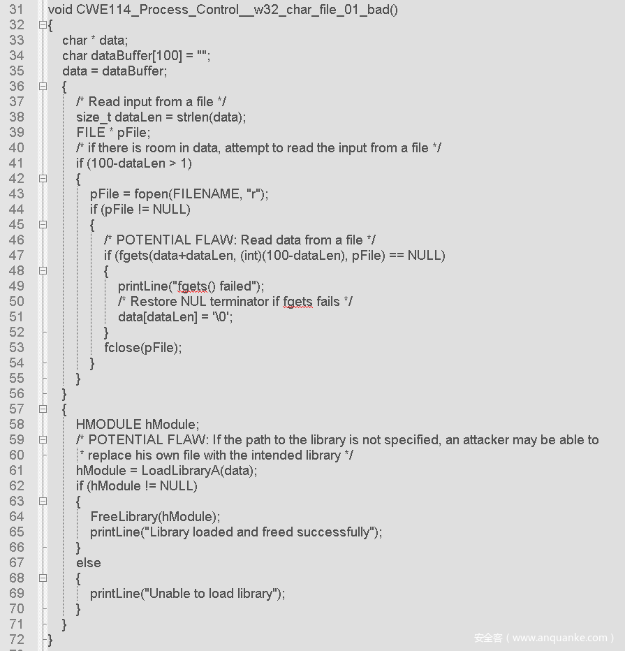 在上述示例代码中,第61行使用 LoadLibraryA() 函数加载动态库,从代码中可以看出,data 在第35行进行初始化,并在第47行通过 fgets() 进行赋值,由于 data 的值通过读取外部文件中的字符串来获取,其值可能为不完整的文件路径,存在“进程控制”问题。