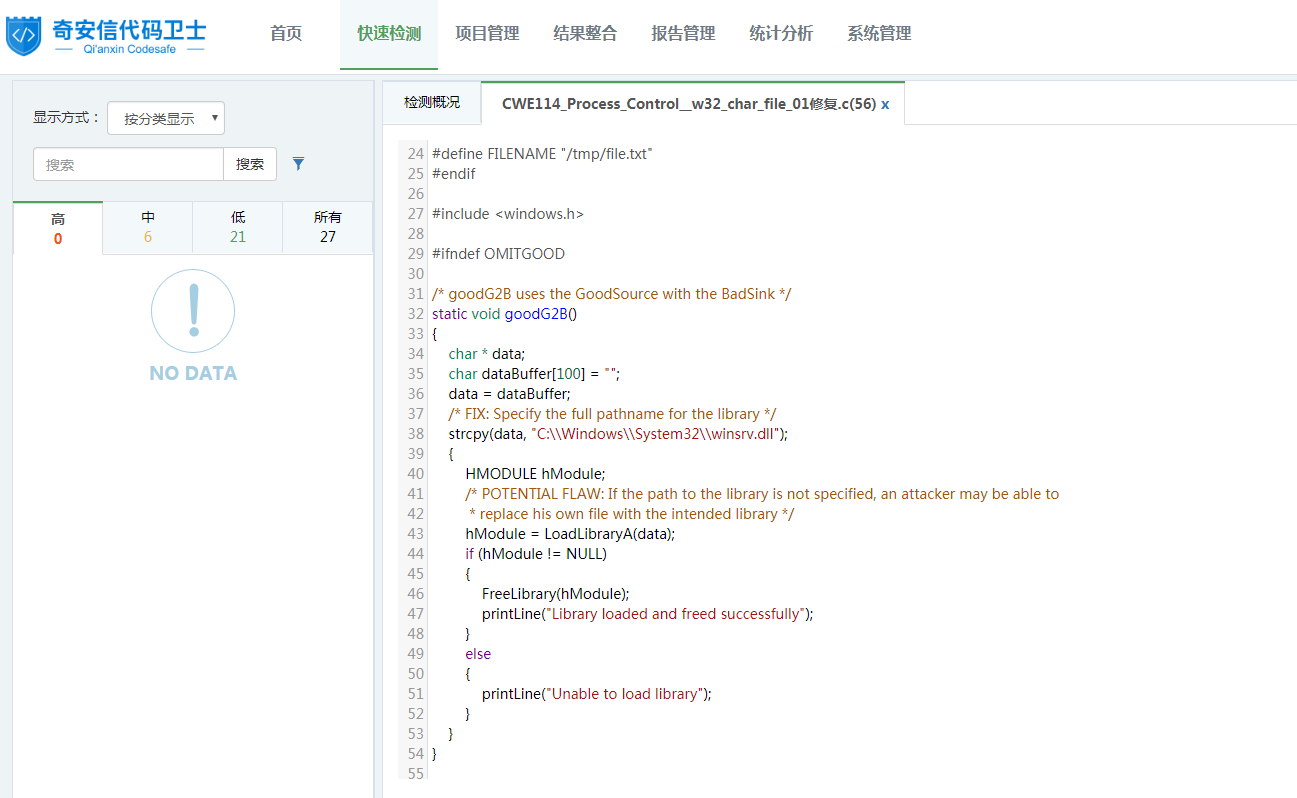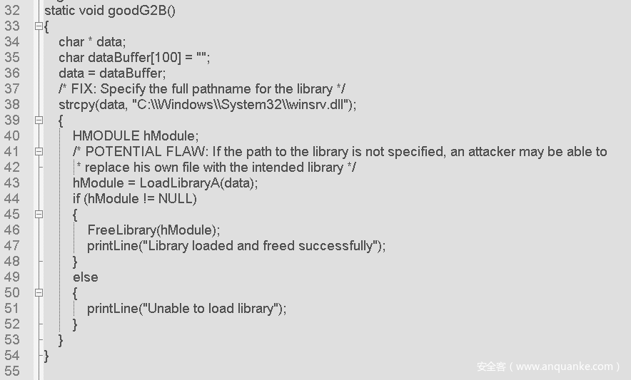在上述修复代码中,Samate给出的修复方式为:在第38行将data明确赋值为“C:\Windows\System32\winsrv.dll”,随后在第43行使用LoadLibraryA() 函数进行动态加载,从而避免了第35行“进程控制”问题。