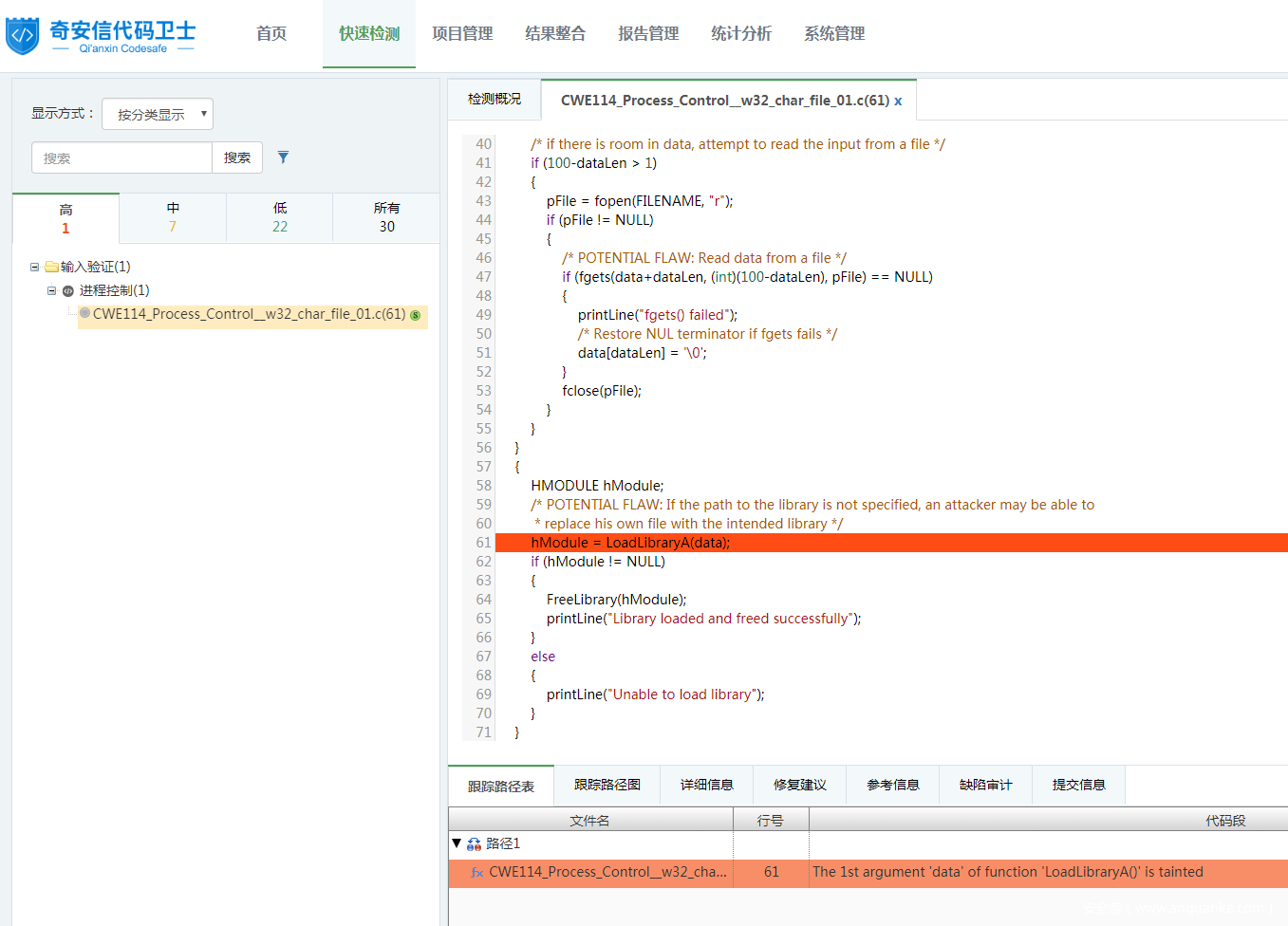 使用代码卫士对上述示例代码进行检测,可以检出“进程控制”缺陷,显示等级为高。如图1所示: