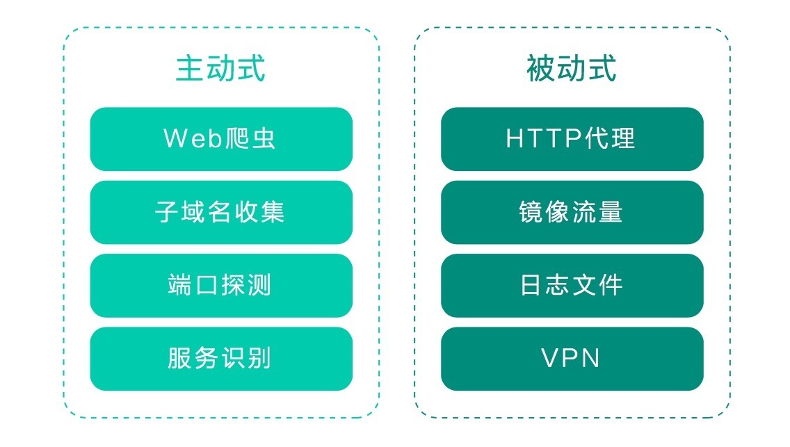 被动式嗅探这种方式是基于已有的流量、日志等数据去分析资产,常见的形式有HTTP代理、镜像流量、日志、VPN等。这种模式可以和企业的其他安全机制相配合,方便打造企业自己的DevSecOps,比如可以下载WAF日志并导入扫描器进行测试,也可以和CI/CD流程相结合,为测试人员配好代理在业务上线前对资产进行安全测试。除此之外,被动获取还有个优势在于,数据源中的请求或服务信息大都是真实存在的业务数据,这可以和主动式的资产获取形成互补,达到更为全面的资产覆盖效果。