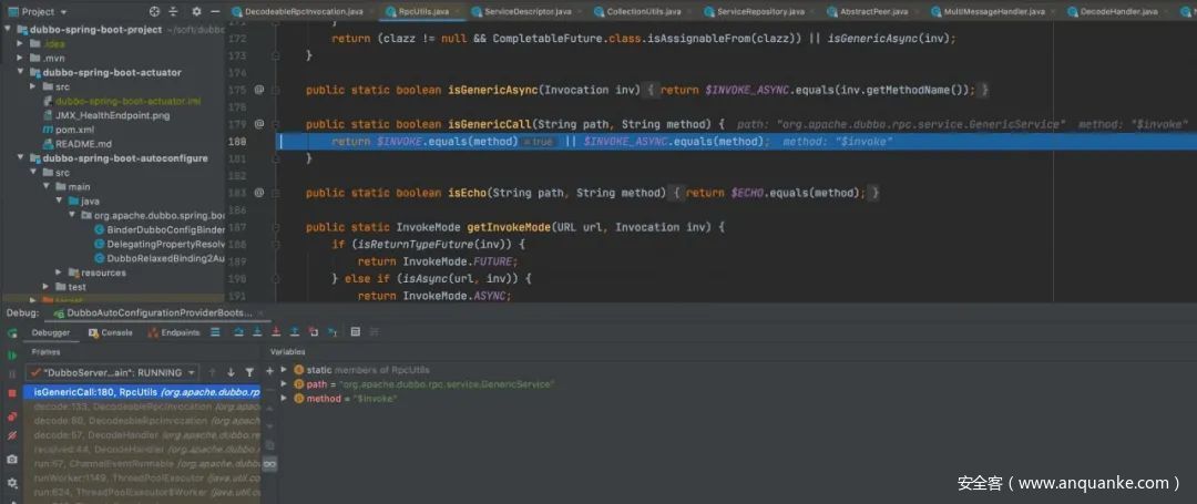 继续跟进,由于pts变量没有被赋值,所以pts== DubboCodec.EMPTY_CLASS_ARRAY表达式成立, 接着进入isGenericCall函数,由于rpc调用设置的method的值为$invoke,此处可以验证通过。