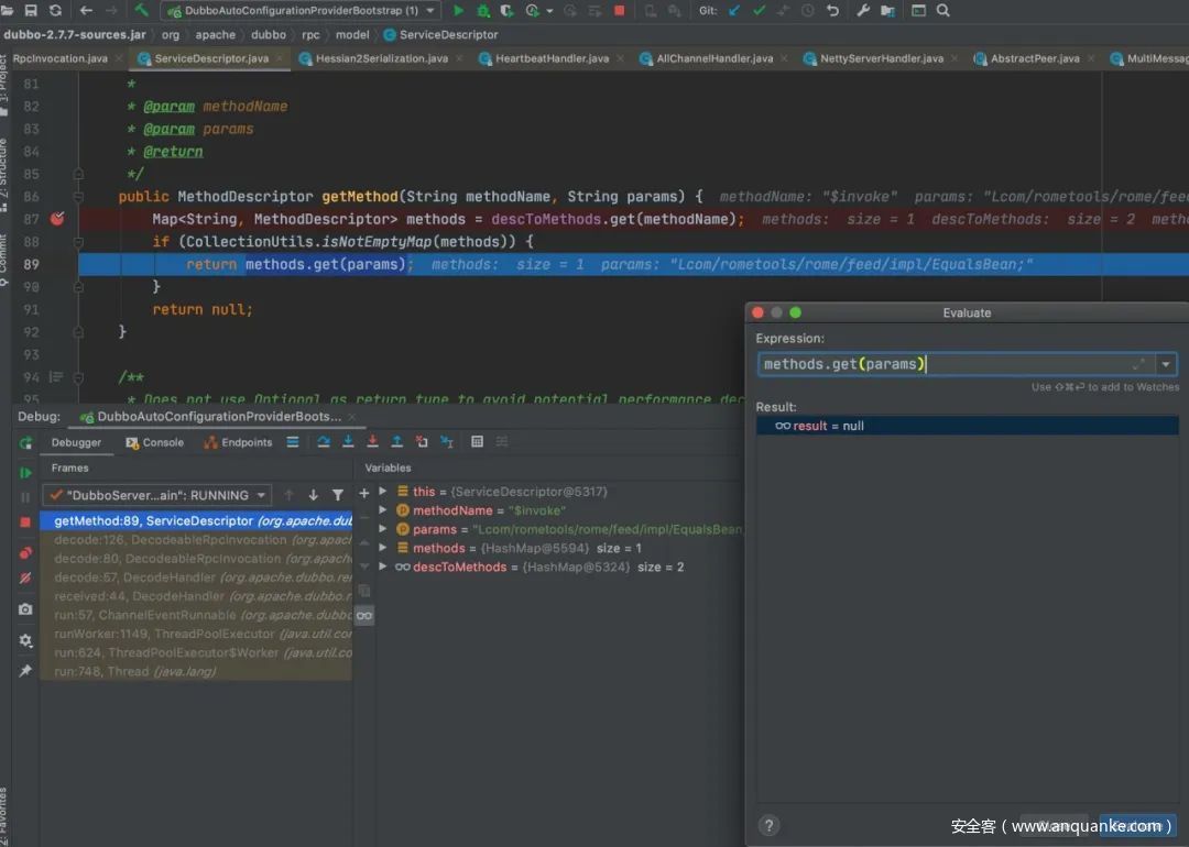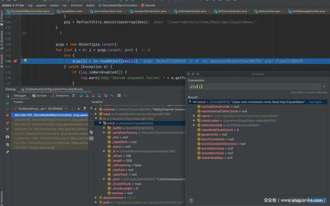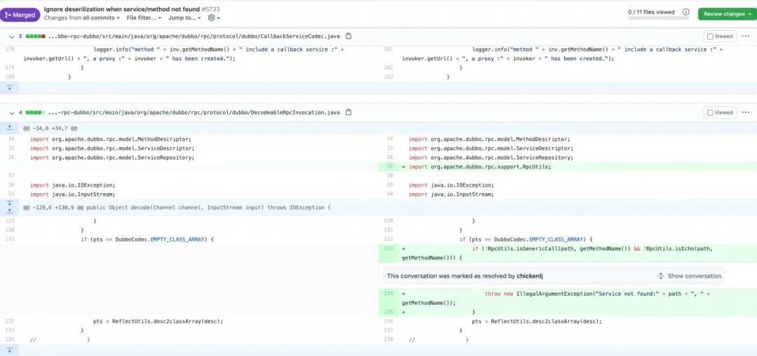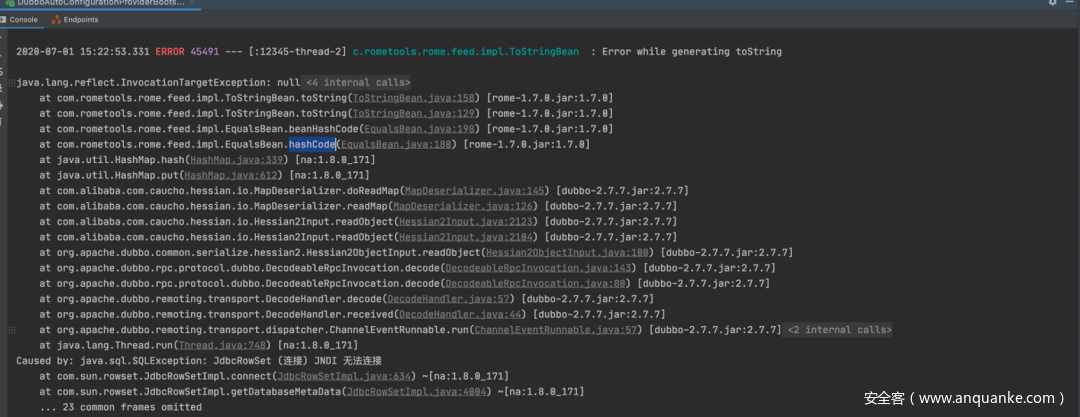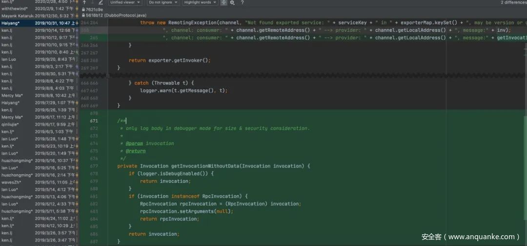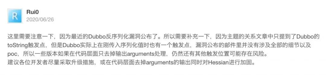 2.漏洞发现者ruilin建议删除RpcInvocation类的toString方法中输出的arguments参数,防范后反序列化攻击。同时对Hessian进行黑白名单加固来防范Hessian反序列化攻击。