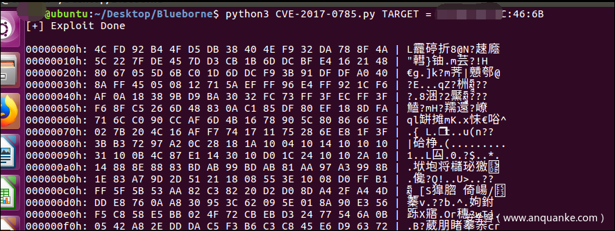 现在关于这五个漏洞的PoC,github有很多,安装上pybluez和pwntools,嗅探到蓝牙地址,便可进行攻击,简单的演示如下: