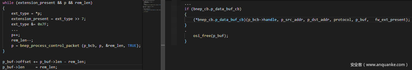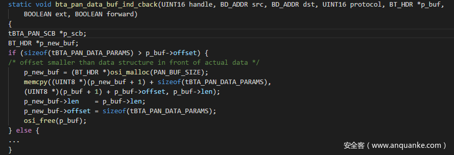 上面的代码中,bnep_process_control_packet()处将发生整数下溢出,使得rem_len成为一个很大的值(比如0xfffd),p_buf->len=rem_len处会将这个值赋值给p_buf->len。If()中,是回调函数处理这个p_buf,在BlueDroid中这个函数是pan_data_buf_ind_cb,这个函数会有一条路径调到bta_pan_data_buf_ind_cback,而在这个函数中: