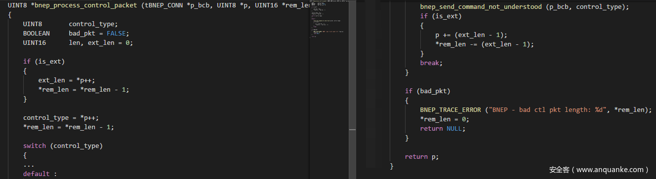 值得注意的是,BNEP连接真正建立起来,需要先处理一个合法的BNEP_FRAME_CONTROL数据包。CVE-2017-0781正是连接还没建立起来,在处理BNEP_FRAME_CONTROL时所发生的问题: