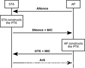 四次握手提供相互身份验证,基于共享密钥技术,这种技术称为成对的主密钥 PairwiseMaster Key(PMK),并协商一个新的会话秘钥 PairWise Transient Key(PTK)。在这次握手中,客户端称为 supplicant,而 AP 称为 authenticator,PMK 由个人网络中的预共享密码生成,在企业网络中使用 802.1x 身份验证来进行协商。PTK 由 PMK,Authenticator Nonce (ANonce),Supplicant Nonce (SNonce)和 supplicant 和 authenticator 使用的 MAC 地址派生而来。一旦生成,PTK 被分割成确认 key(KCK), 加密 Key(KEK),和临时 Key(TK),确认 Key 和加密 Key 使用来保护握手消息,TK 和数据机密性协议是用来保护正常数据帧,如果使用了 WPA2,四次握手协议也传输现在的 Group Temporal Key 组临时密钥(GTK)到 supplicant。