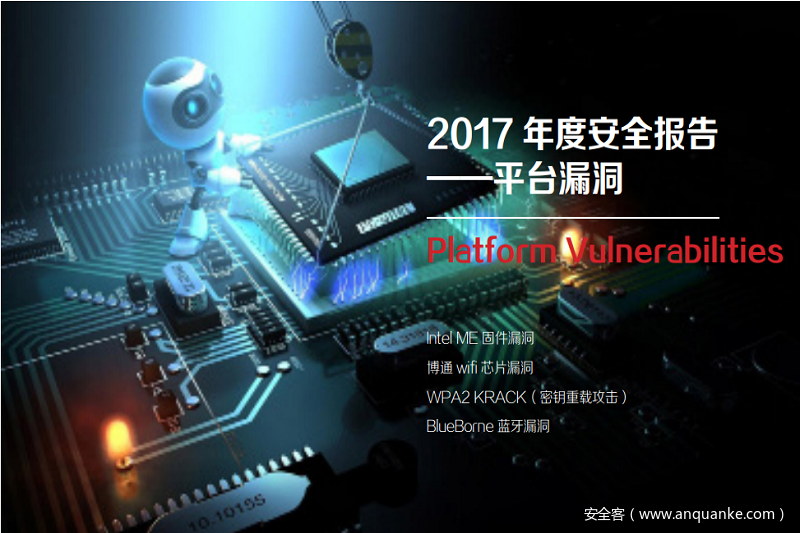 平台安全是计算机安全体系中重要的组成部分。平台对上层应用,服务,功能提供支持,主要体现在硬件,固件,协议及协议实现等。这方面有许多攻击方法,比如边信道攻击,中间人攻击,旁侧降权攻击等。这些高级攻击方法,如果结合平台安全中的漏洞,将会十分危险。本文是360CERT对2017年平台安全的总结。