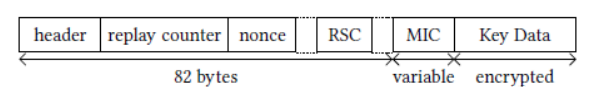 四次握手中的每一条消息都是使用 EAPOL 帧格式(如图 1)。对字段进行介绍首先,消息的头部定义了所代表的消息类型,我们将使用 message n 和 MsgN 来代表四次握手中第 n 段消息。Replay count(重放计数器)字段用于检测重放的数据帧:authenticator 在发送一个帧之后会自增长,当 supplicant 对 authenticator 发送的 EAPOL 帧做出应答时,它使用相同的 replaycount。Nonce 字段是一个随机的 nones 值,这个随机值是 supplicant 和 authenticator 在生成新的会话秘钥这一步骤产生的。接下来,如果 EAPOL 帧传输一个组密钥,RSC(接受序列)包含了 key 起始包号。组密钥是存储在 Key Data 字段,使用加密 Key(KEK)加密。最后,使用消息确认 Key(KCK)来进行完整性校验. MIC(Message Integrity Check)。