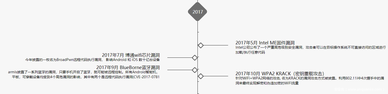 Intel ME固件漏洞主要影响的是服务器,个人PC平台。巧合的是,今年的一枚博通wifi芯片漏洞影响数十亿台Android 和 IOS设备,移动设备在今年也被披露存在平台安全问题,未能幸免。